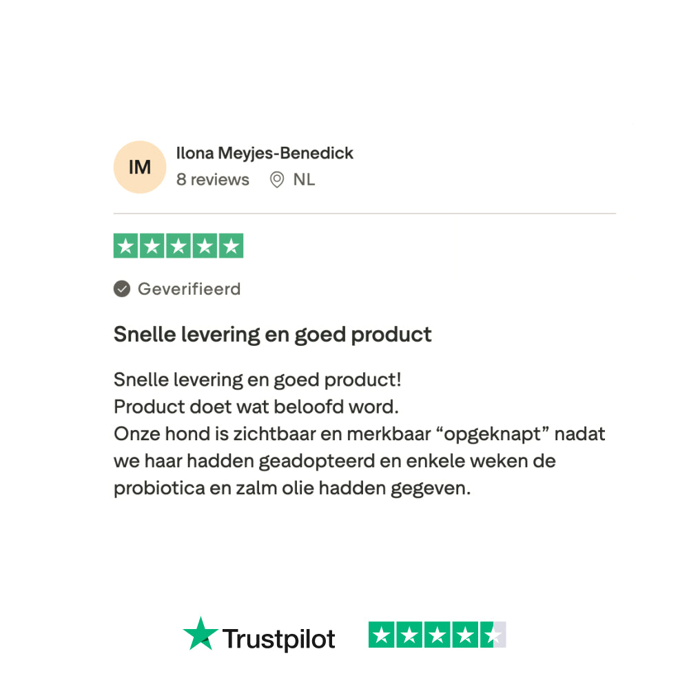 De meeste hondenbaasjes geven aan dat ze na 3-5 weken verbetering zien, bij sommige duurt het iets langer tot 6-8 weken. De natuurlijke ingrediƫnten ondersteunen je hond van binnenuit, waardoor het even kan duren voordat je zichtbare veranderingen opmerkt.