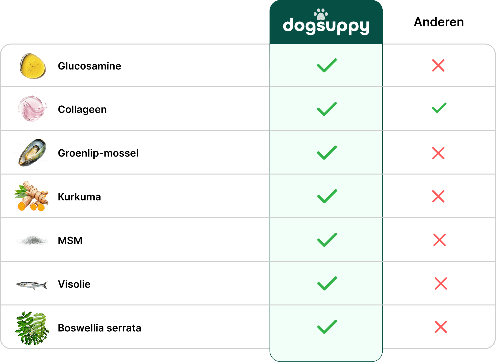 Dankzij de unieke combinatie van glucosamine, collageen, groenlipmossel, kurkuma, MSM en visolie: