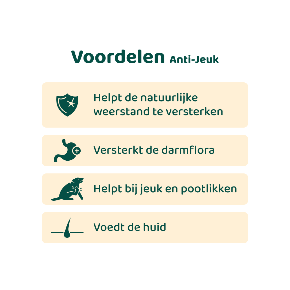 Heeft je hond last van jeuk op allerlei plaatsen, inclusief de kont? Gaat hij/zij krabben, likke aan de poten, likken aan de anus, …? Dan is dit de perfecte bundel om jouw hond te helpen. Onze 2 bestsellers Anti-Jeuk en Anaalklieren zorgen voor een krachtige combinatie om deze irritatie grondig te bestrijden.