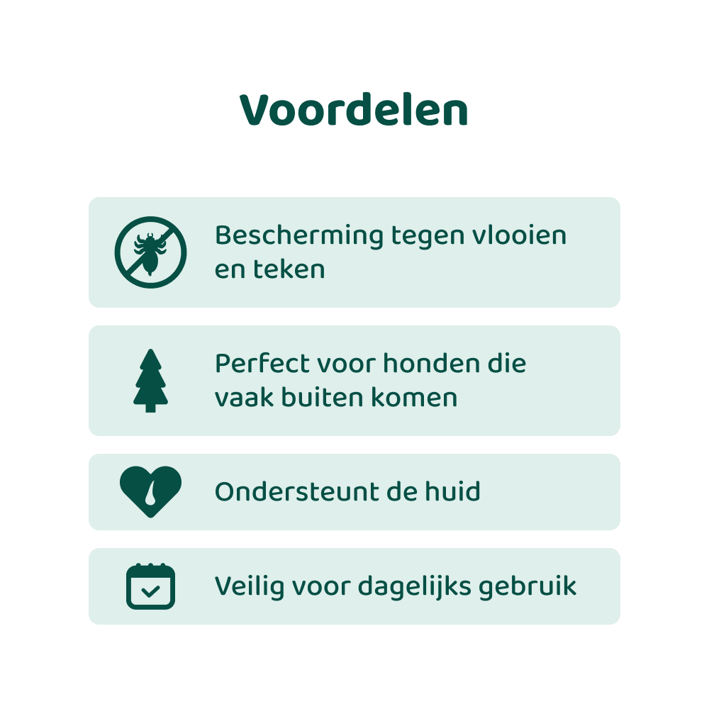 Biedt een natuurlijke bescherming tegen parasieten. De combinatie van Eucalyptus Citriodora olie (= citroen eucalyptusolie) en Eugenia Caryophyllus olie (= kruidnagelolie) staat bekend om hun afwerende werking tegen vlooien, teken en muggen. Deze essentiële oliën bevatten natuurlijke bestanddelen zoals citronellal en eugenol, die parasieten op afstand houden zonder agressieve chemicaliën.