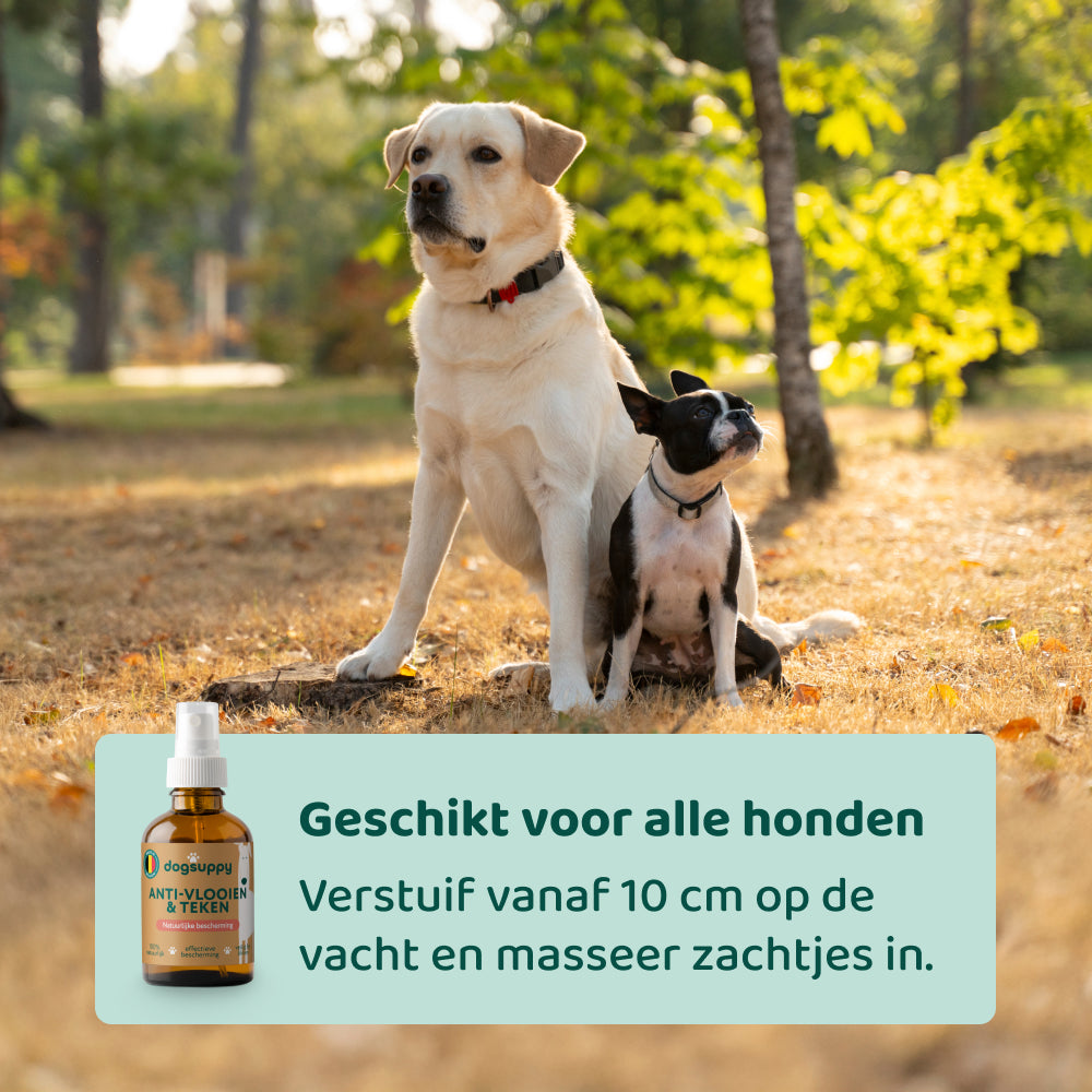 De Anti-Vlooien & Teken Spray is speciaal ontwikkeld voor honden die: