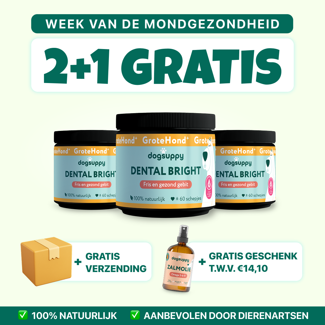 Het Dental Bright poeder bevat bruine algen, die ervoor zorgen dat je hond meer speeksel aanmaakt. Speeksel is essentieel voor een goede mondhygiëne, omdat het voedselresten wegspoelt en ongewenste bacteriën helpt verminderen. Dit ondersteunt het verminderen van tandplak. Bovendien bevat elke schep ongeveer 1 miljard goede bacteriën (pre- en probiotica) die bijdragen aan het evenwicht van bacteriën in de mond van je hond. Dit resulteert in minder tandplak, een frissere adem en een gezonder gebit. Natuurlijke ingrediënten zoals pepermunt en eucalyptus zorgen daarbij voor een extra frisse adem.