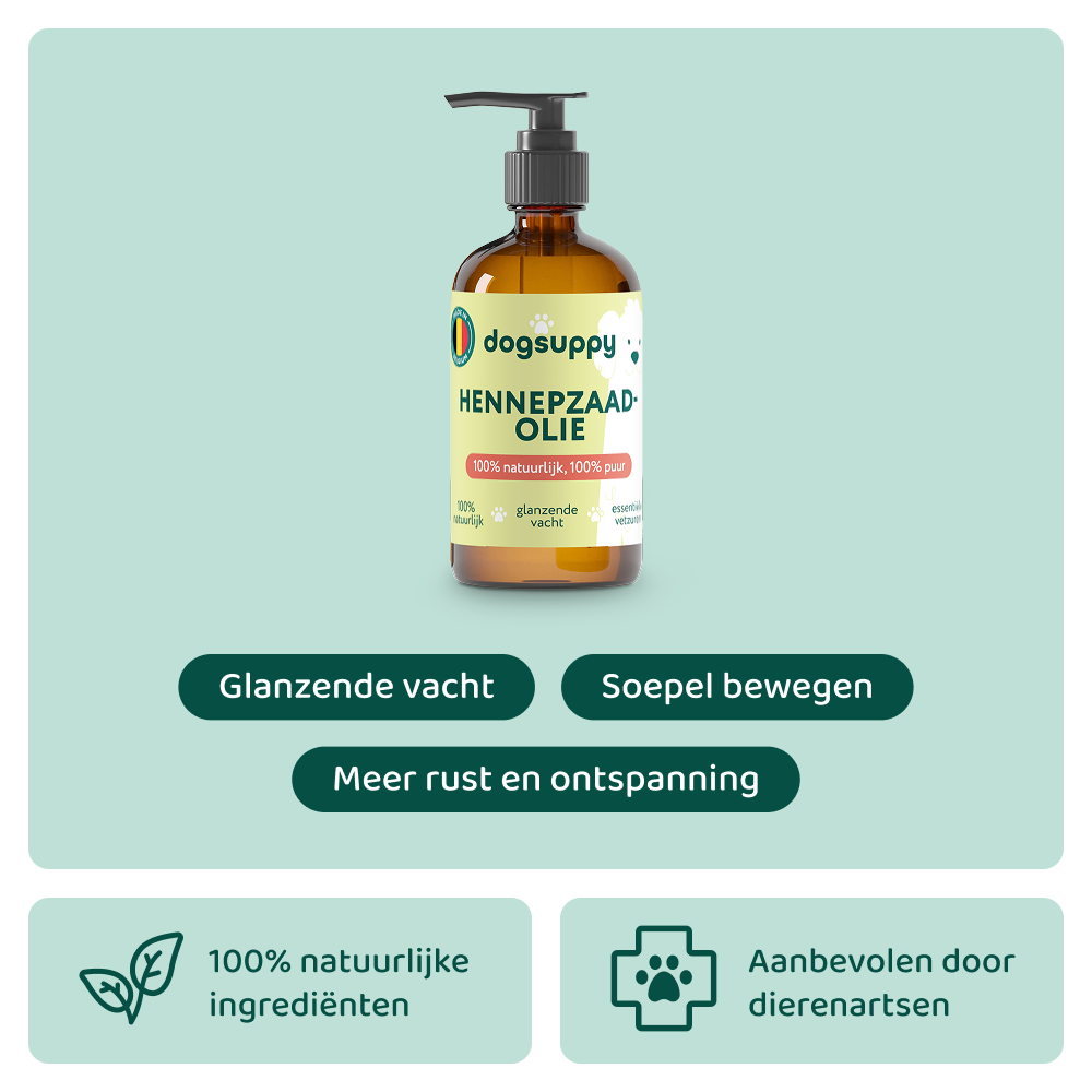 Hennepzaadolie is een natuurlijke bron van omega 3 en 6, die essentieel zijn voor een gezonde huid, een glanzende vacht, en een evenwichtige gemoedstoestand. Dit supplement is vrij van kunstmatige toevoegingen en geschikt voor gevoelige honden.