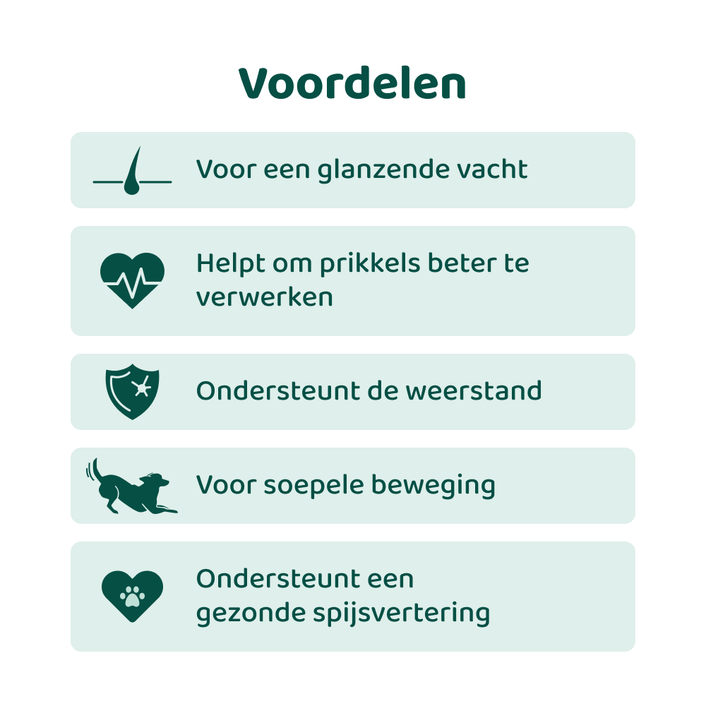 Dit 100% natuurlijk supplement bevat geen GMO’s, gluten, granen, suikers of kunstmatige kleurstoffen en is ontwikkeld door gepassioneerde nutritionisten met meer dan 10 jaar ervaring in dierensupplementen. We gebruiken uitsluitend grondstoffen die voldoen aan de Europese regelgeving.