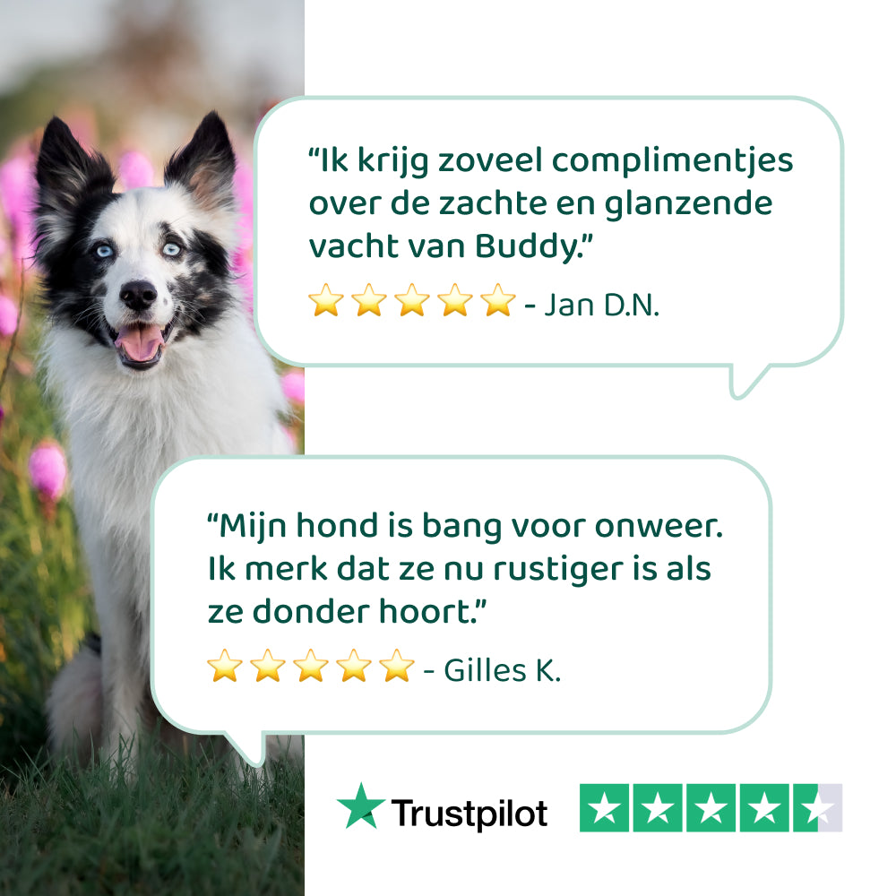 De meeste hondenbaasjes geven aan dat ze na 3-5 weken verbetering zien, bij sommige duurt het iets langer tot 6-8 weken. De natuurlijke ingrediënten ondersteunen je hond van binnenuit, waardoor het even kan duren voordat je zichtbare veranderingen opmerkt.
