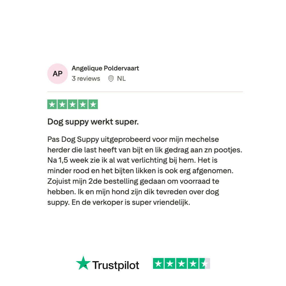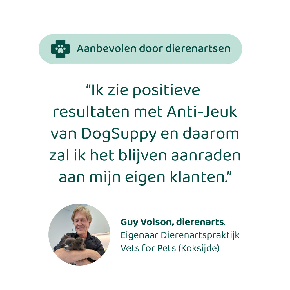 "Bij mijn klanten zie ik minder jeukklachten en een gezondere huid dankzij DogSuppy’s Anti-Jeuk. Daarom raad ik het keer op keer aan."