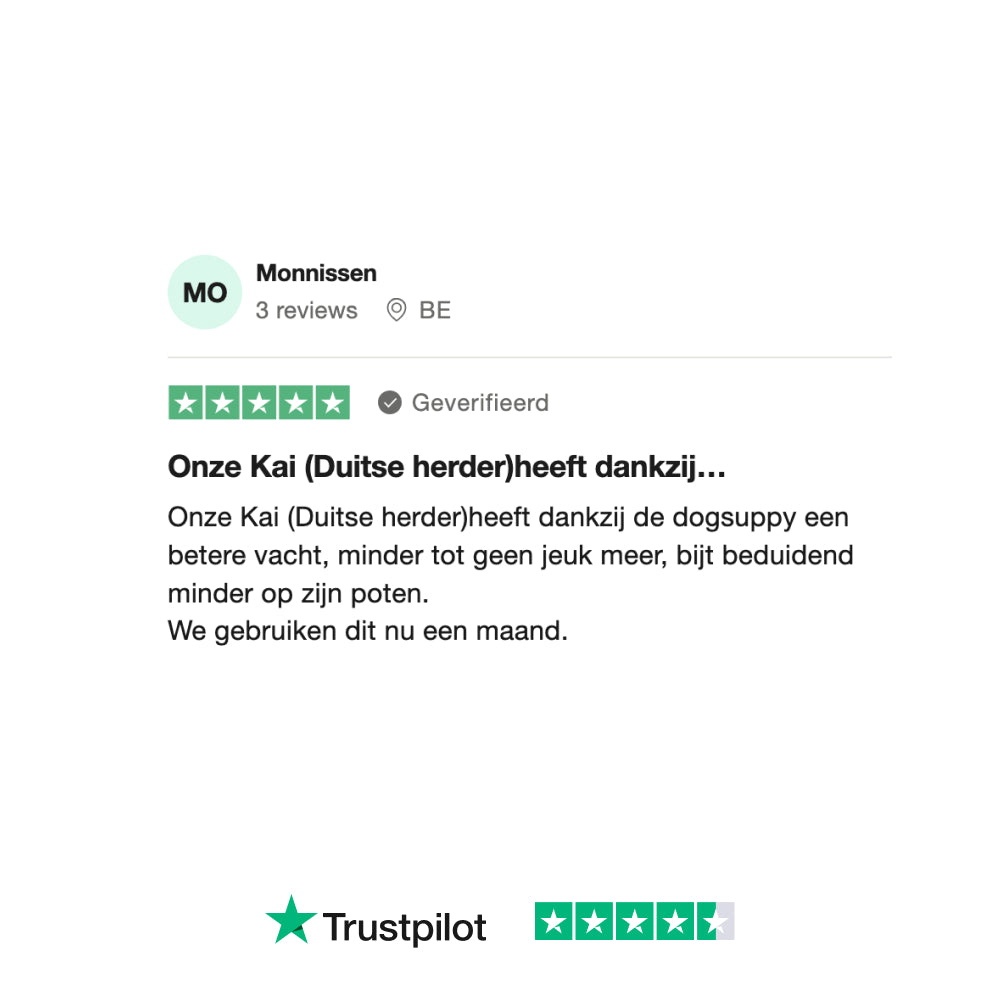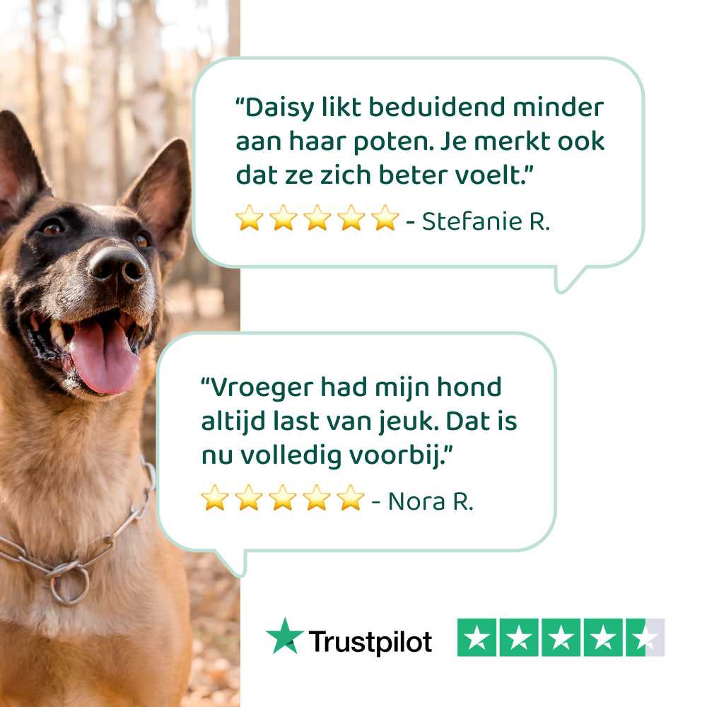 De meeste hondenbaasjes geven aan dat ze na 3-5 weken verbetering zien, bij sommige duurt het iets langer tot 6-8 weken. De natuurlijke ingrediënten ondersteunen je hond van binnenuit, waardoor het even kan duren voordat je zichtbare veranderingen opmerkt.