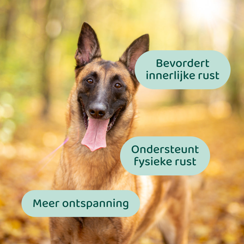 Verminder stress, angst en onrust bij je hond met natuurlijke kalmerende ondersteuning.
