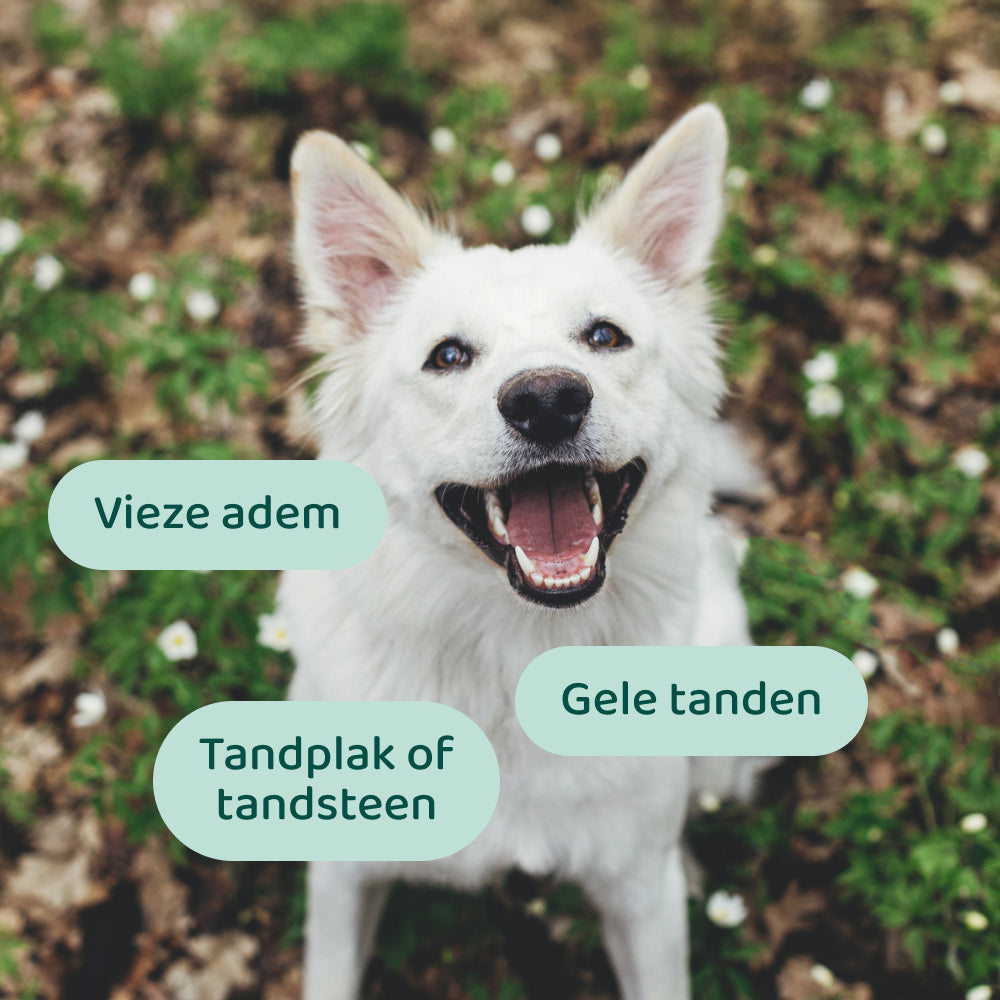 Dental Bright bevat bruine algen en pre- en probiotica. Deze ondersteunen een gezonde speekselproductie en bevorderen een evenwichtige bacteriebalans in de mond van je hond. Het speeksel helpt bij het behouden van een schoon gebit. Daarnaast bevat het natuurlijke ingrediënten zoals pepermunt en granaatappel, die bijdragen aan een frisse adem.