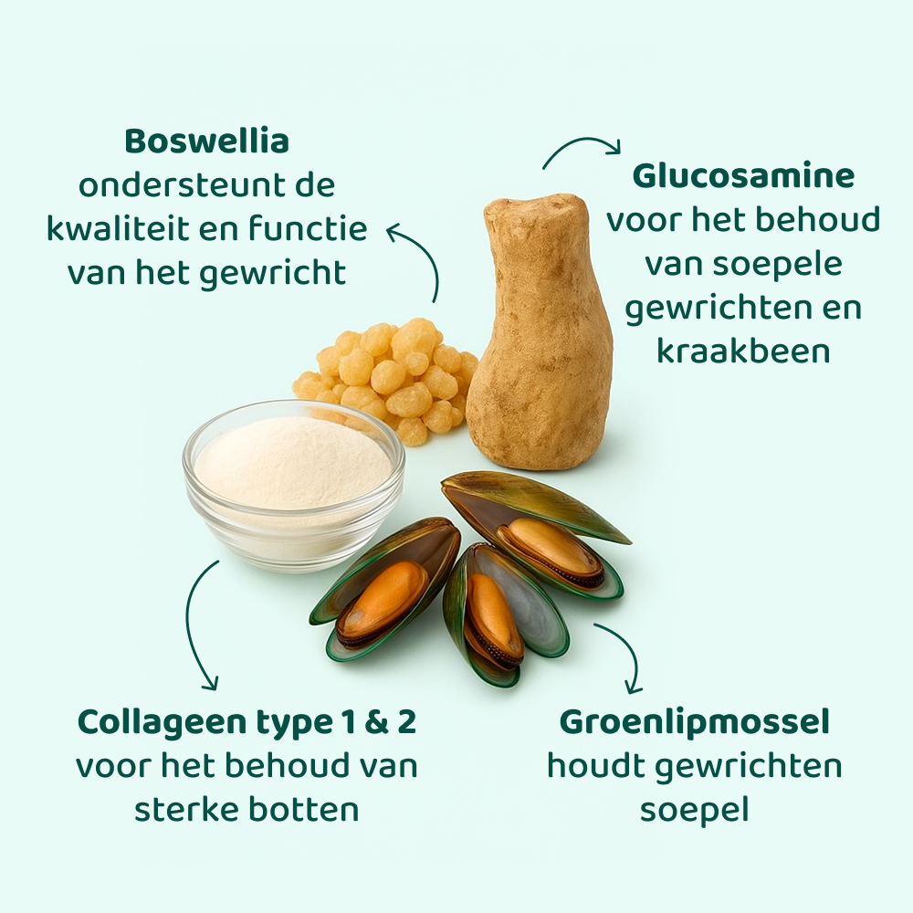Hoofdingrediënten: Collageen type 1 + 2, Boswellia, MSM (+Vitamine C), Glucosamine