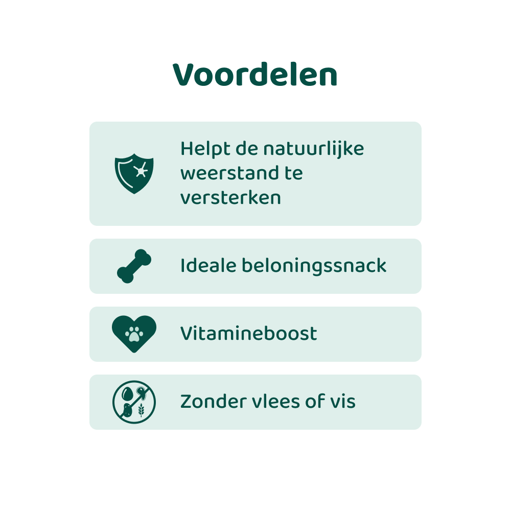 Deze heerlijke snack bevat vitamines en mineralen die bijdragen aan de algehele gezondheid van jouw hond. Het is ook nog eens super lekker, waardoor het geven van de dagelijkse vitaminen een echt verwenmomentje wordt!
