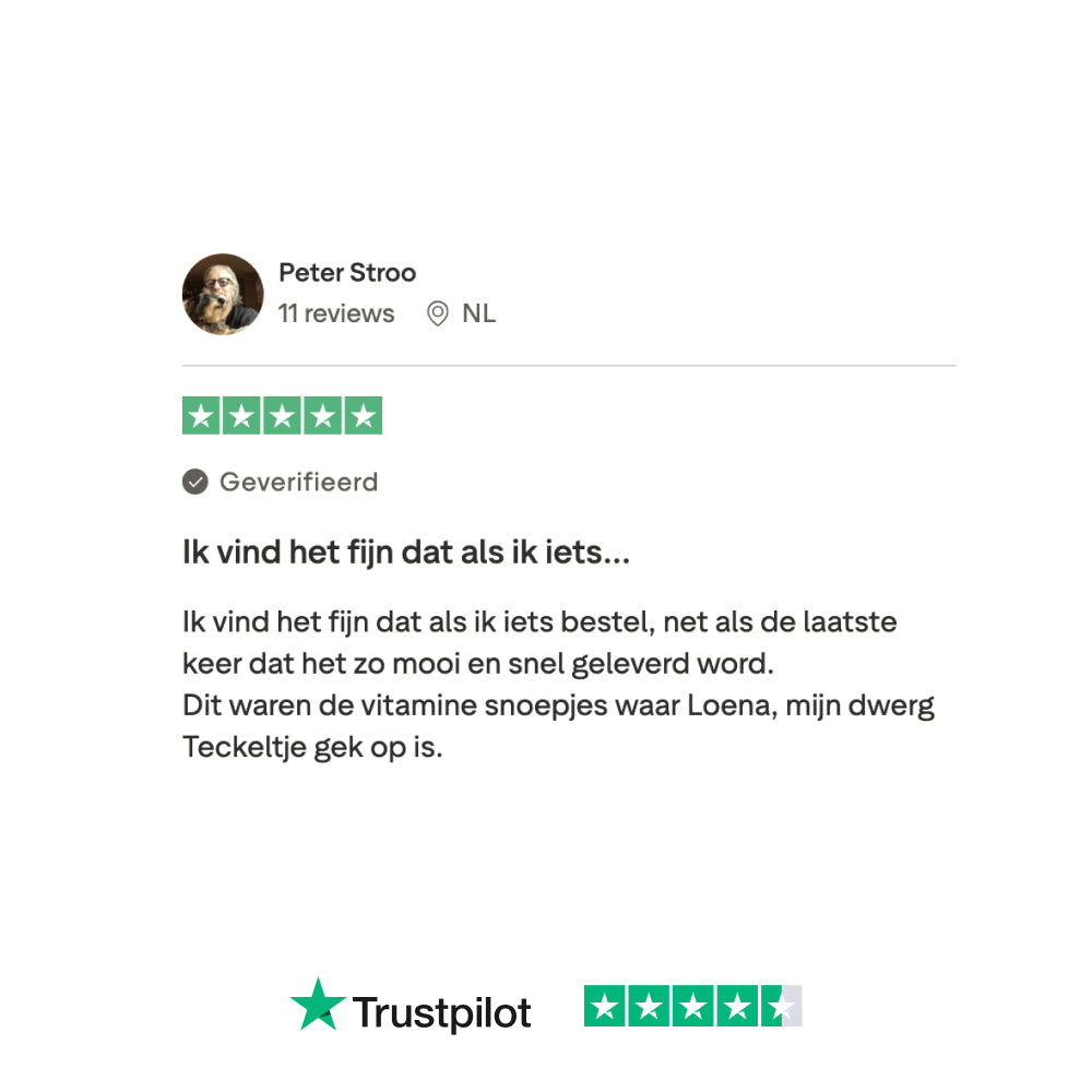Als je hond de Vitamine Boost snacks niet meteen wil eten, probeer de snack dan op een speelse manier aan te bieden, bijvoorbeeld als beloning of door het in kleinere stukjes te breken en door de normale voeding te mengen. Honden kunnen soms even wennen aan nieuwe smaken of texturen. Mocht je hond het na een paar pogingen nog steeds weigeren, neem dan gerust contact met ons op voor advies of een alternatief.