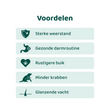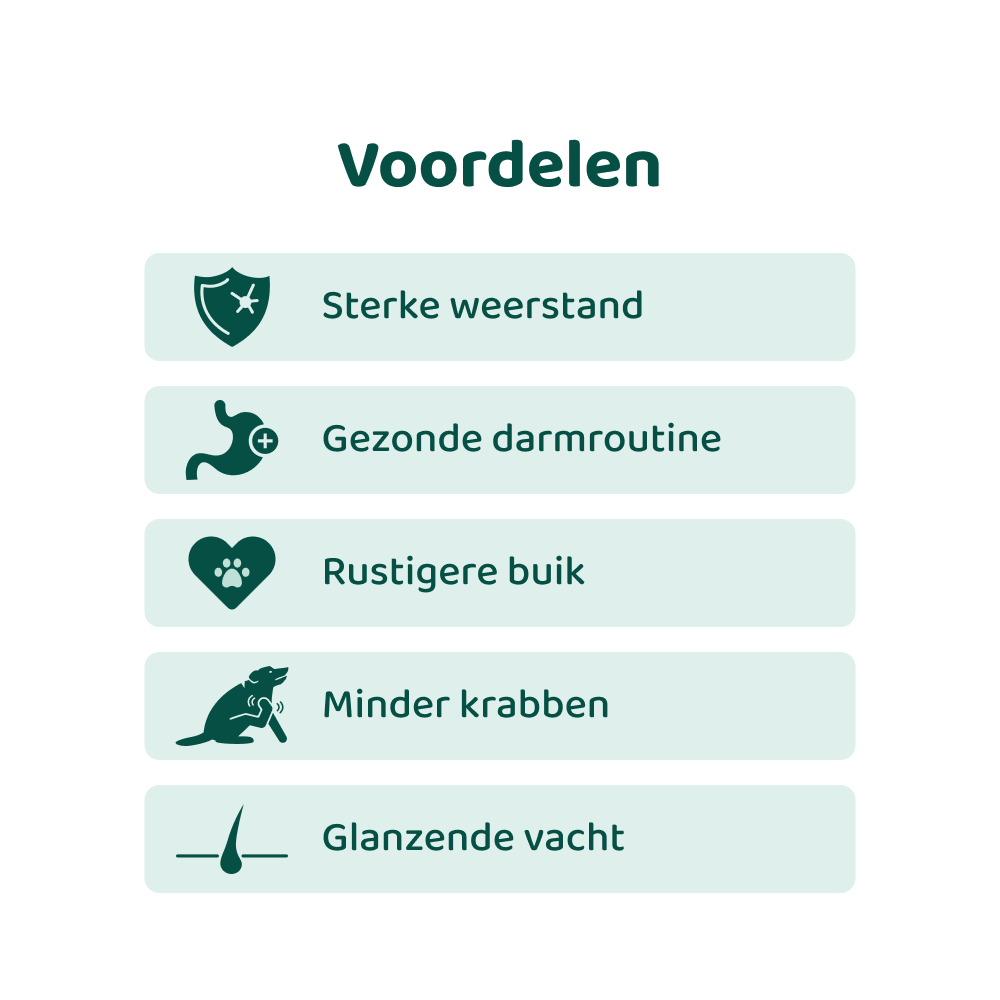 Naast de pre- en probiotica worden er nog extra grondstoffen zoals pectines, zink,... gebruikt om de darmgezondheid van je hond nog beter te ondersteunen. Deze unieke formule zorgt voor heel tevreden baasjes!