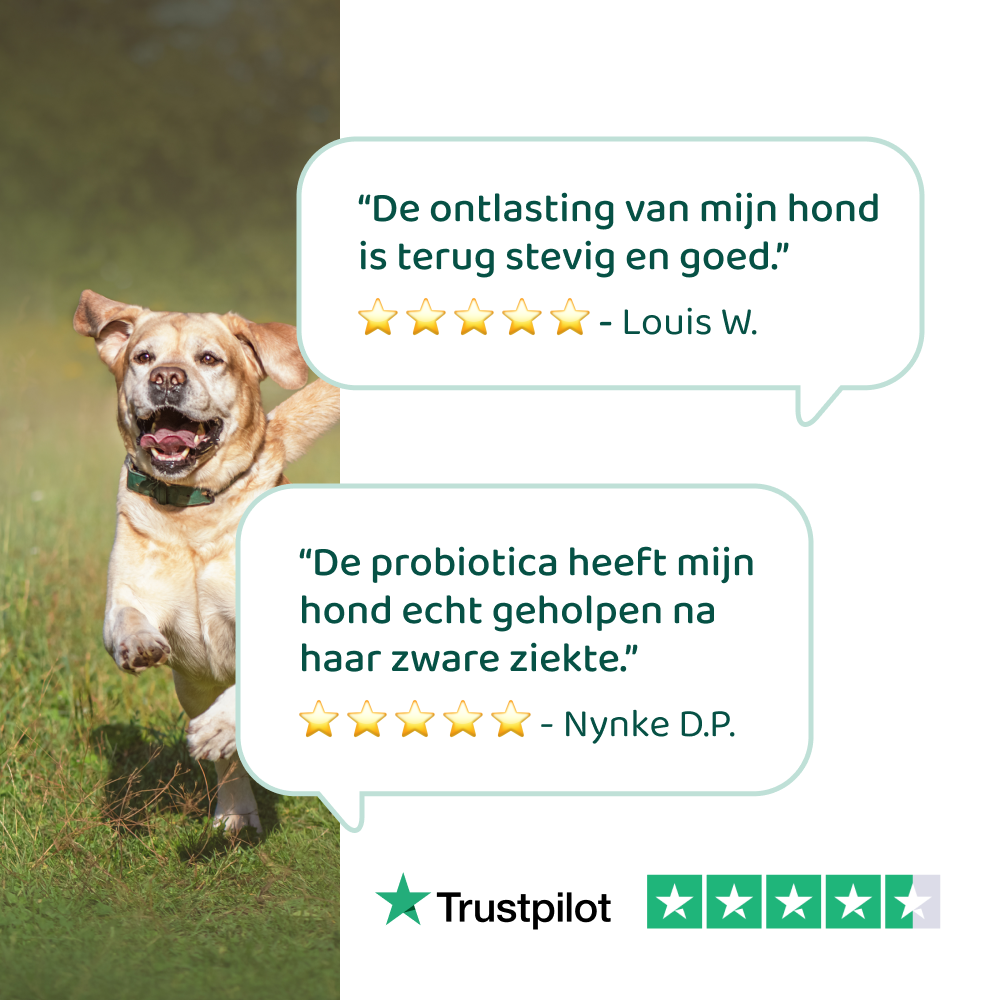 De meeste hondenbaasjes geven aan dat ze na 3-5 weken verbetering zien, bij sommige duurt het iets langer tot 6-8 weken. De probiotica en natuurlijke grondstoffen pakken het probleem inwendig aan waardoor het even kan duren voor je dit ook effectief te zien krijgt. Alles hangt af van de mate waarin de darmen hersteld moeten worden, bij de ene hond vraagt dit een grotere inspanning dan bij de andere.