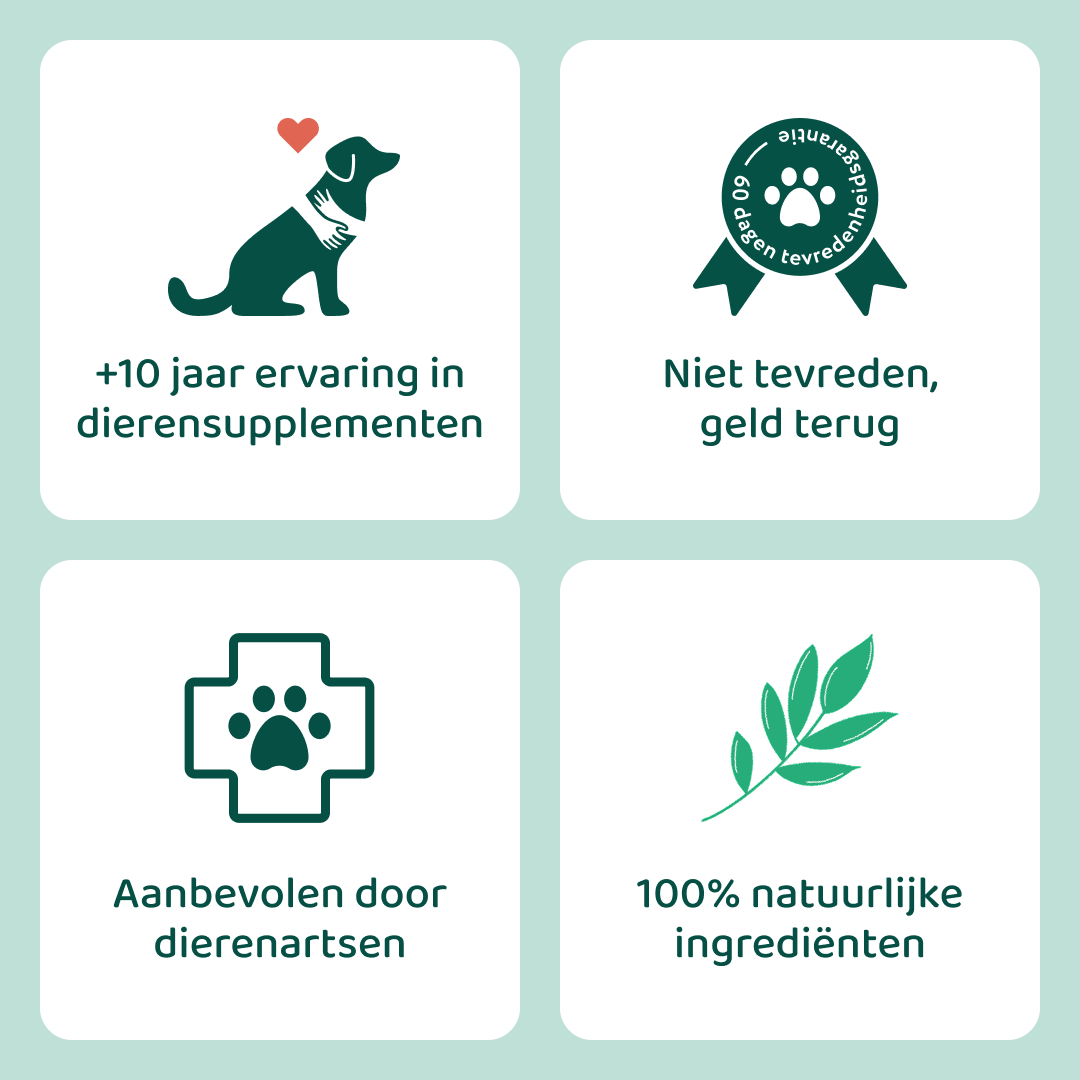 Daarom bieden we – als een van de weinige merken in Nederland en België – een 60 dagen geld-terug-garantie aan. Je hebt dus een periode van twee maanden om zelf te ontdekken hoe dit supplement kan bijdragen aan het welzijn van je hond.