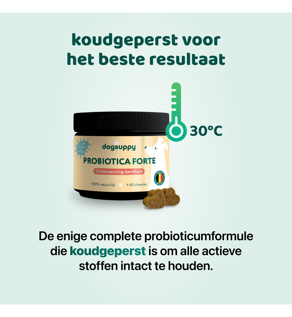 2. DogSuppy heeft ervoor gekozen om de probiotica te combineren met prebiotica, postbiotica en paraprobiotica in hetzelfde mengsel. Op deze manier zorgen we ook voor de 'voeding' voor de goede bacteriën.
