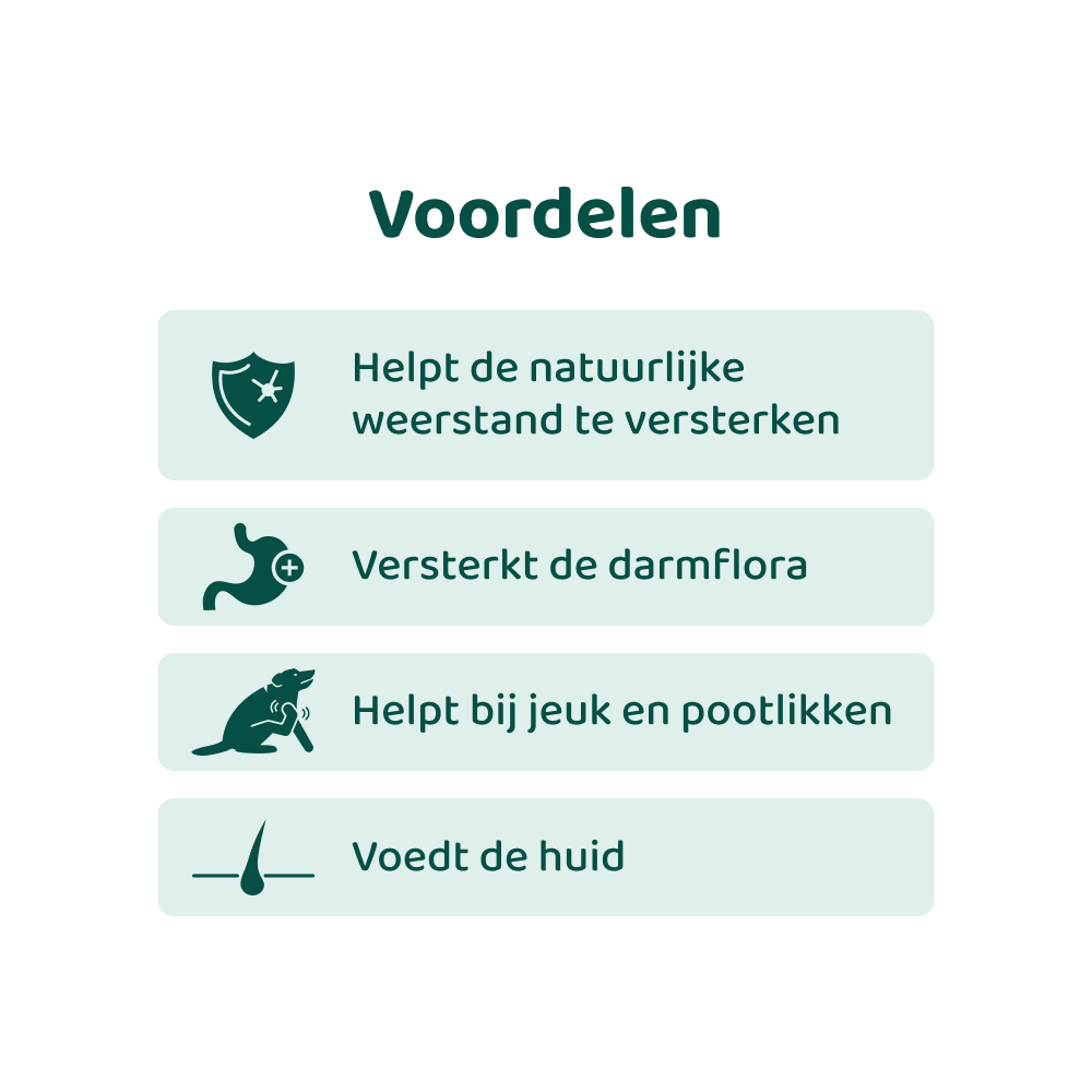 Dit 100% natuurlijk supplement bevat geen gluten, granen, suikers of kunstmatige kleurstoffen en is ontwikkeld door gepassioneerde nutritionisten met meer dan 10 jaar ervaring in dierensupplementen. We gebruiken uitsluitend grondstoffen die voldoen aan de Europese regelgeving.