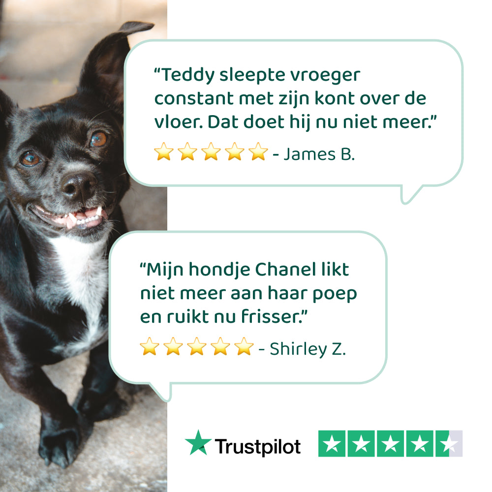 De meeste hondenbaasjes geven aan dat ze na 3-5 weken verbetering zien, bij sommige duurt het iets langer tot 6-8 weken. De probiotica en natuurlijke grondstoffen pakken het probleem inwendig aan waardoor het even kan duren voor je dit ook effectief te zien krijgt.
